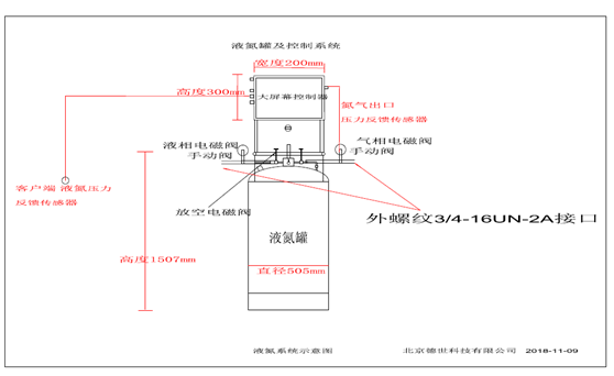 液氮罐補(bǔ)液控制系統(tǒng)由液氮補(bǔ)液罐、低溫智能化控制系統(tǒng)、閥門(mén)組件控制電磁閥和真空比例閥箱、PLC編程器、智能化控制人機(jī)交互控制終端、不間斷電源、溫度及壓力傳感器監(jiān)控探頭系統(tǒng)及反饋電路系統(tǒng)組成,功能可根據(jù)客戶需求,定制相關(guān)罐體自動(dòng)增壓-出液-排氣的壓力及流量控制程序。