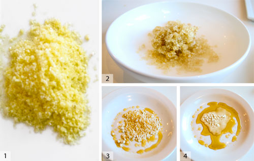 不可凍結的對象和凍結的酷對象:盡管本文不是關于歷史和信貸的問題,但我必須在這里做個例外,因為西班牙El Restaurante Calima的Dani Garcia實際擁有我的橄欖油流程米即將解釋。他使用液氮將橄欖油和橄欖油乳液冷凍成超出您想象的形狀和質地。液氮冷凍油不會傷害您的舌頭,因為該油不會像水那樣包裹熱量。