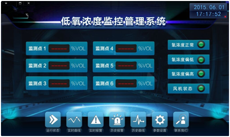 b) 軟件直接點擊低氧濃度監控管路系統;按鈕進如;該界面 上可查看到系統運行實際狀態并儲存、打印報警記錄。